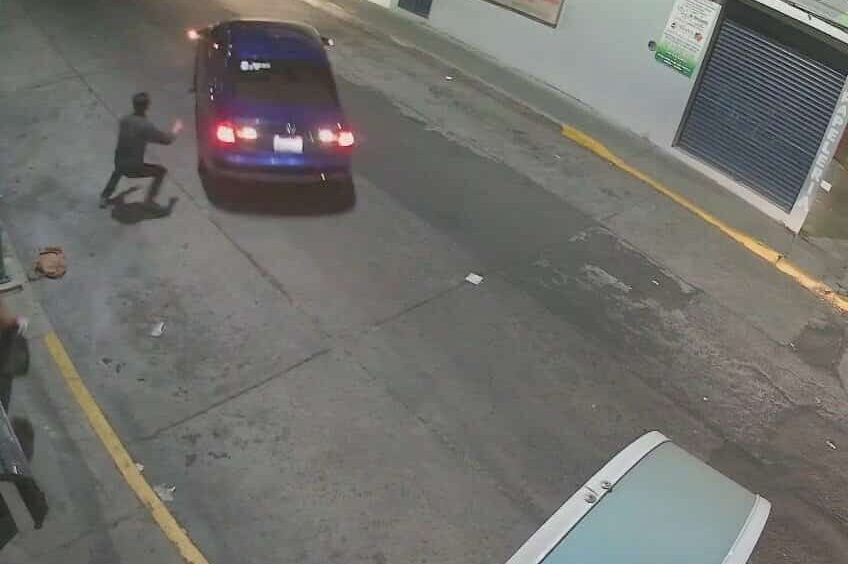 Al realizar esta acción agresiva, el hombre descuidó su automóvil y olvidó accionar el freno de mano, por lo que el coche comenzó a retroceder sin control, con la puerta del piloto abierta, la cual impactó levemente a otro vehículo que estaba estacionado en una esquina. Posteriormente, la unidad se detuvo al chocar con la retaguardia la fachada de un domicilio.