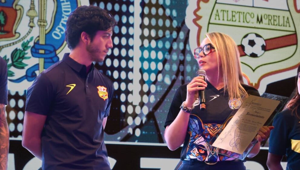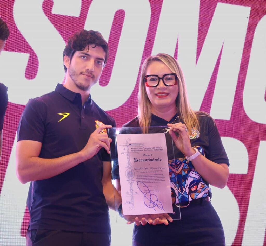 Durante el evento, la rectora hizo entrega al director Deportivo del Atlético Morelia, José Luis Cendejas, de un reconocimiento para el presidente del Club, José Luis Higuera, por la confianza deposita en la UMSNH y el trabajo conjunto que se ha concretado.