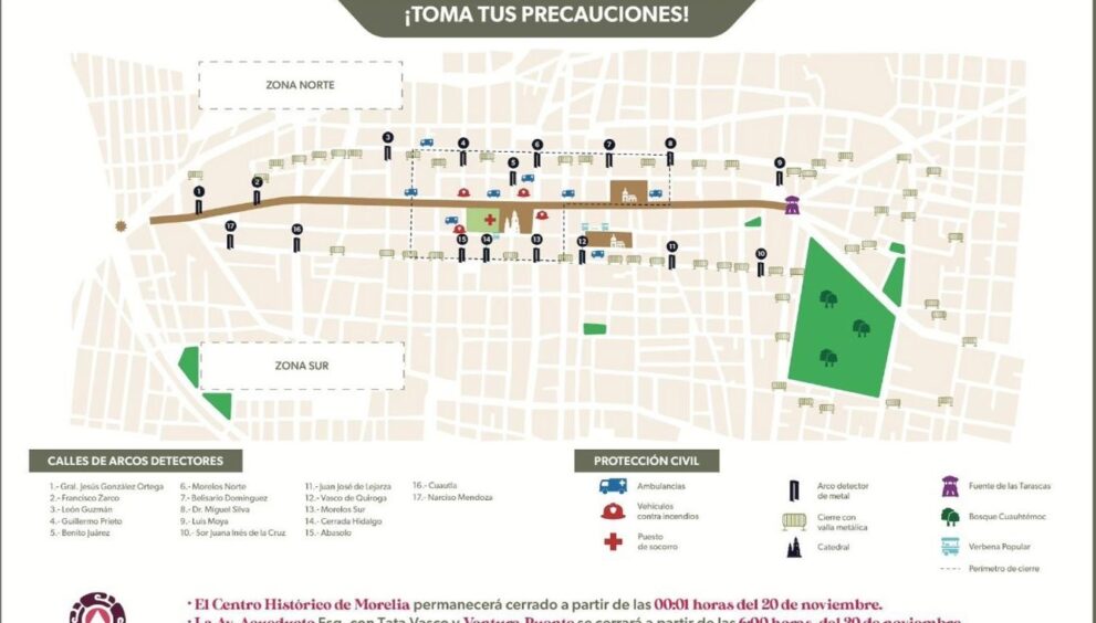 Morelia, Michoacán, 19 de noviembre de 2025.- La Secretaría de Seguridad Pública (SSP) informa que a partir de las 00:01 horas del jueves 20 de noviembre iniciarán los cierres vehiculares en calles y avenidas del Centro Histórico de Morelia, con motivo del desfile del 115 Aniversario de la Revolución Mexicana.