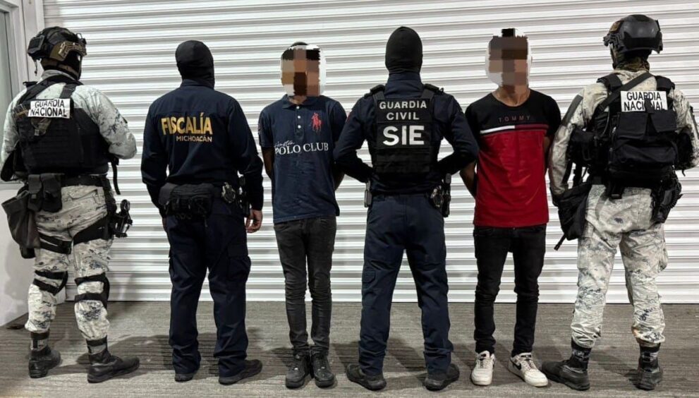 Buenavista, Michoacán, 10 de octubre de 2025.- Agentes de las secretarías de Seguridad Pública (SSP) y de la Defensa Nacional (Defensa), así como de la Guardia Nacional (GN) junto con la Fiscalía General del Estado (FGE), detuvieron en el municipio de Buenavista a dos generadores de violencia de la región en posesión de dos armas y droga.