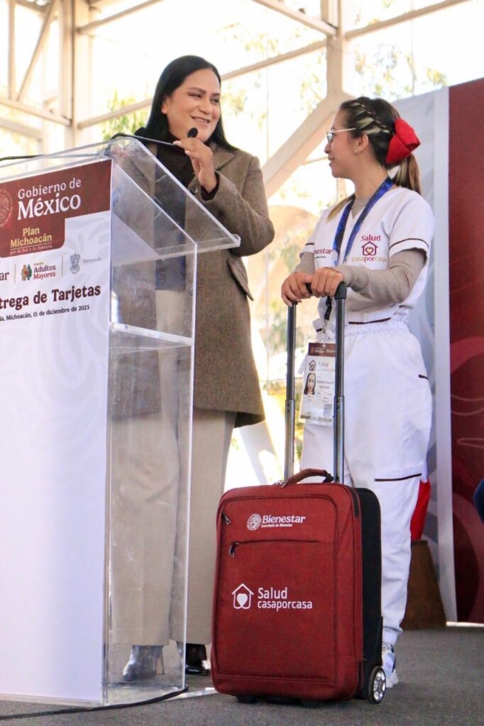 Morelia, Michoacán, 15 de diciembre de 2025.- Como parte del Plan Michoacán por la Paz y la Justicia, la secretaría de Bienestar, Ariadna Montiel Reyes, encabezó el inicio de la entrega de Tarjetas de Bienestar a 7 mil 226 nuevas beneficiarias del Programa de Apoyo para el Bienestar de Niñas y Niños, Hijos de Madres Trabajadoras y de 9 mil 117 derechohabientes de la Pensión para el Bienestar de las Personas Adultas Mayores en los municipios de Pátzcuaro y Morelia.