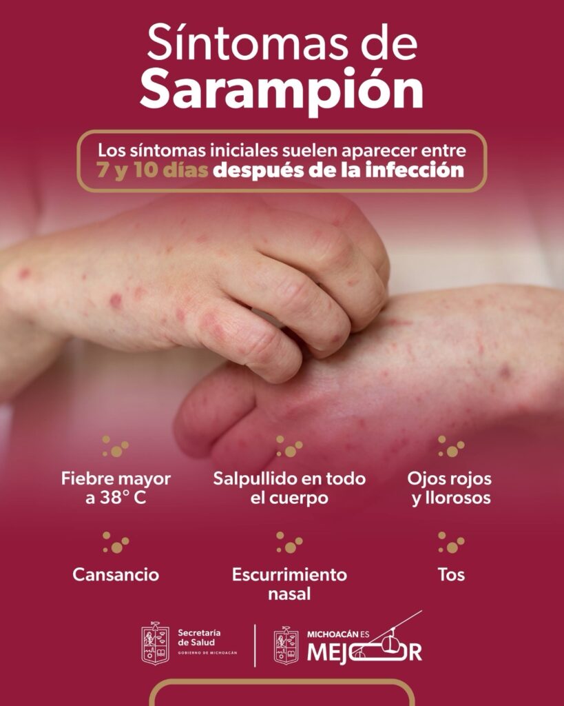 Morelia, Michoacán, 18 de febrero de 2026.- Para fortalecer la vigilancia epidemiológica, la Secretaría de Salud de Michoacán (SSM) hace un llamado a la ciudadanía a identificar síntomas de sarampión de manera temprana y acudir de inmediato a su unidad de salud más cercana ante cualquier sospecha.