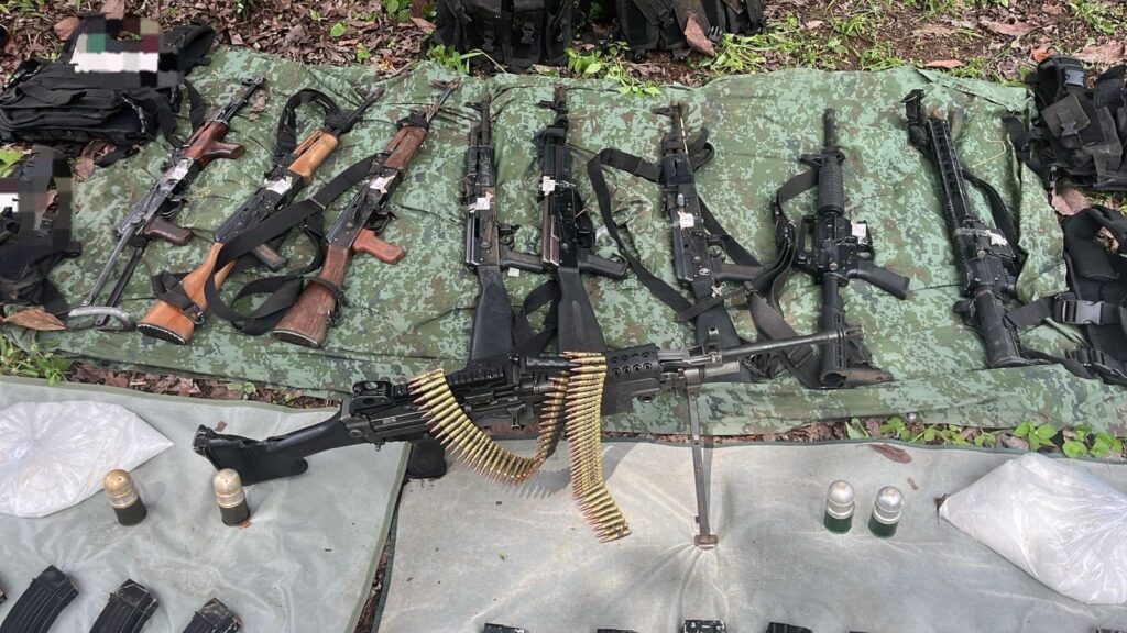 Uruapan, Michoacán, 3 de octubre de 2025.- Elementos de las secretarías de Seguridad Pública (SSP) y de la Defensa Nacional (Defensa) aseguraron una ametralladora, ocho fusiles, cuatro granadas de aditamento, droga y vehículos como resultado de las tareas del operativo Blindaje Uruapan.