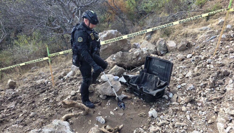 Morelia, Michoacán, 11 de diciembre del 2025.- La Secretaría de Seguridad Pública (SSP), a través del Agrupamiento Especializado en Artefactos Explosivos y Materiales Peligrosos, informó que cerca del mediodía se llevó a cabo el aseguramiento de una granada de gas localizada luego de una excavación realizada en una zona en construcción, localizada en Tres Marías en Morelia, tras un reporte canalizado por el C5i.
