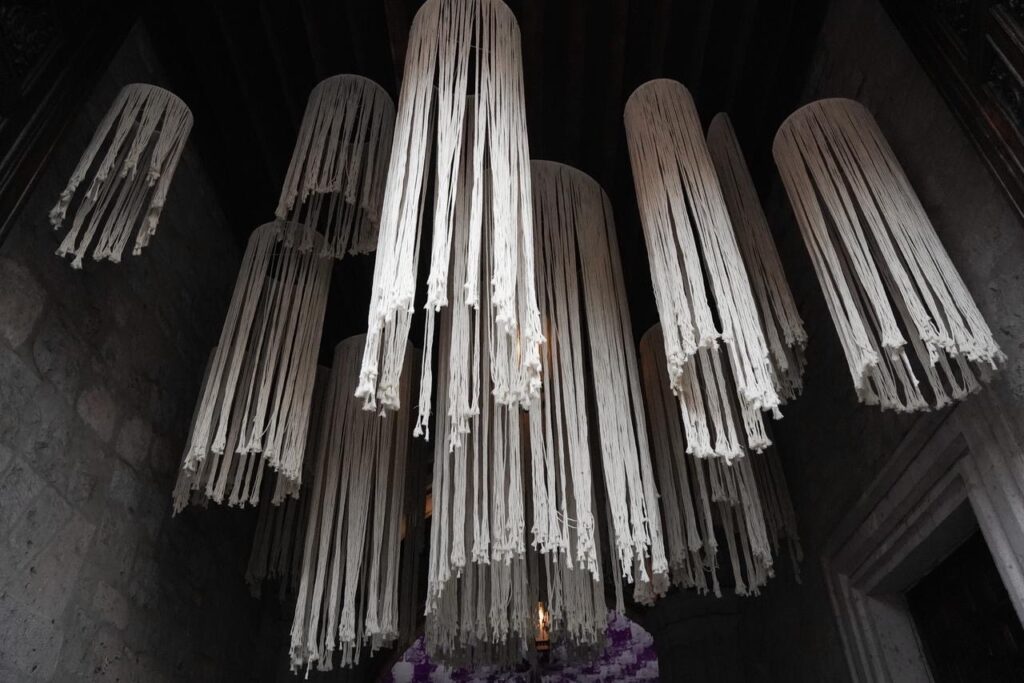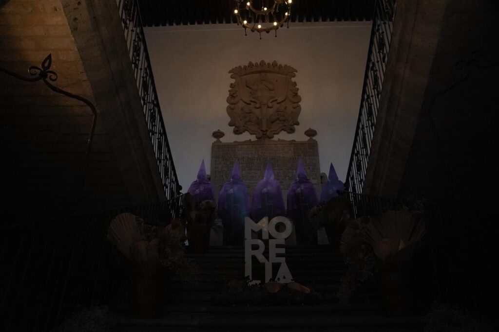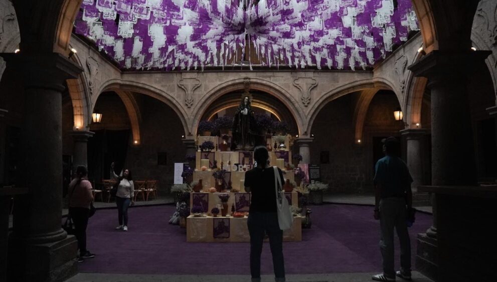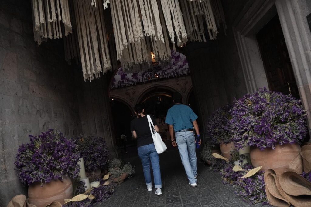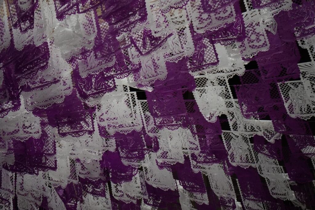 La pieza, montada en el patio central del recinto, destaca por el uso de tonos morados —color litúrgico asociado al recogimiento—, así como por la presencia de papel picado, veladoras, arreglos florales y elementos tradicionales que remiten a la espiritualidad de esta temporada.
