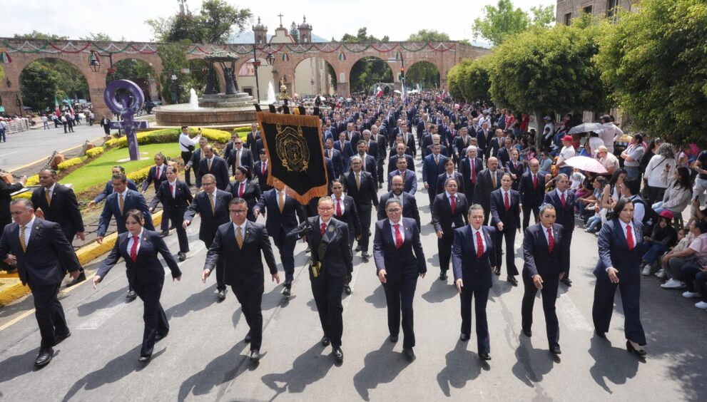 Con paso firme y entre aplausos del público, el contingente de la UMSNH integrado por cerca de 800 elementos entre funcionarias, funcionarios, directoras y directores de escuelas, facultades e institutos, consejeros universitarios, docentes, estudiantes e integrantes de la galardonada Banda de Guerra recorrieron la Avenida Madero haciendo vibrar el corazón del Centro Histórico de Morelia con la historia, juventud y orgullo académico que representa la Máxima Casa de Estudios.