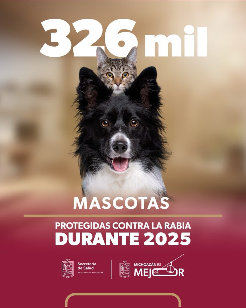 Morelia, Michoacán, 5 de enero de 2026.- Como parte de las acciones permanentes de control de zoonosis y protección a la salud pública, la Secretaría de Salud de Michoacán (SSM) informa que durante el año 2025 se aplicaron 326 mil 400 dosis de vacuna antirrábica a perros y gatos en todo el territorio estatal.