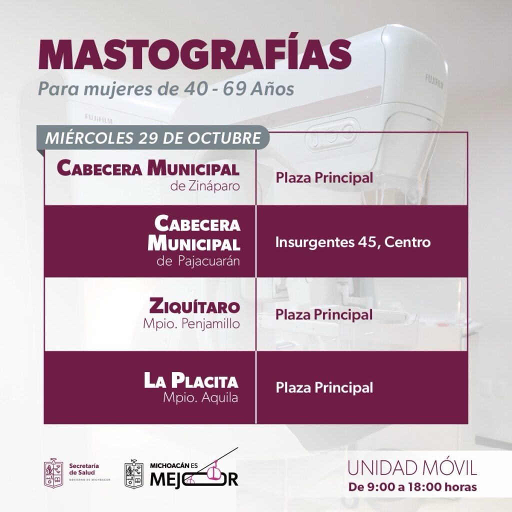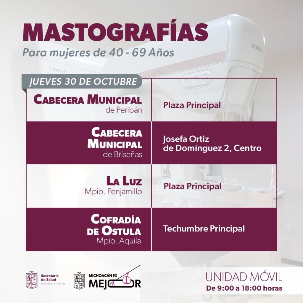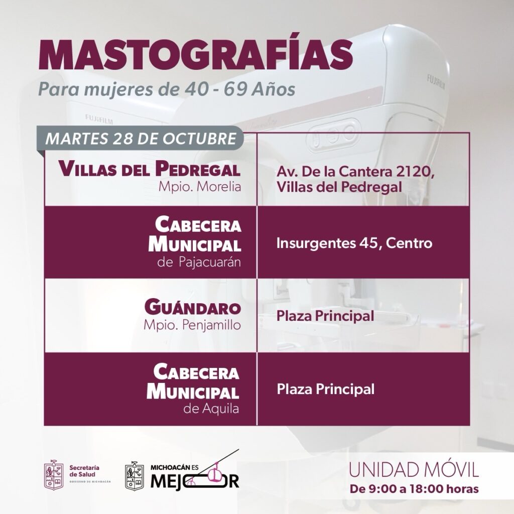Morelia, Michoacán, 26 de octubre de 2025.- La Secretaría de Salud de Michoacán (SSM) cierra el Mes de Sensibilización sobre el Cáncer de Mama con el despliegue de unidades móviles de mastografías del 27 al 31 de octubre, para atender a mujeres de 40 a 69 años en 10 municipios.