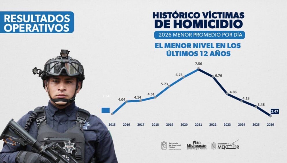 Morelia, Michoacán, 6 de marzo de 2026.- En lo que va del 2026, Michoacán registra una tendencia histórica a la baja con un promedio diario de 2.47 víctimas de homicidio doloso, siendo la menor cifra en los últimos 12 años, así lo detalló el gobernador Alfredo Ramírez Bedolla.