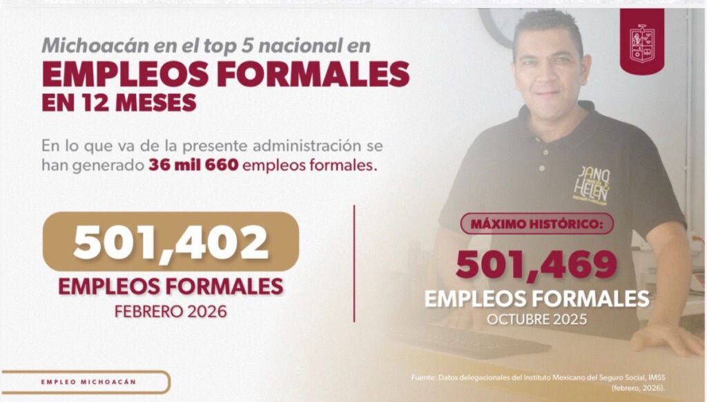 Morelia, Michoacán, 16 de marzo de 2026.- Resultado de las políticas de fomento económico y la confianza del sector empresarial, Michoacán se ha consolidado como una de las cuatro entidades con mayor dinamismo laboral en el país. Al cierre del último reporte de febrero pasado, el estado alcanzó un registro de 501 mil 402 trabajadores asegurados ante el Instituto Mexicano del Seguro Social, reafirmando su posición de liderazgo en la creación de empleo formal, así lo señaló el gobernador Alfredo Ramírez Bedolla.