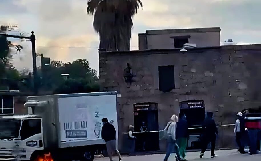 Morelia, Mich.- Lunes 01 de diciembre de 2025.- Un grupo de normalistas vandalizó un camión repartidor de productos lácteos en el Centro Histórico de Morelia. Los individuos arrojaron una bomba molotov a la unidad para incendiarla, trascendió en la labor noticiosa.