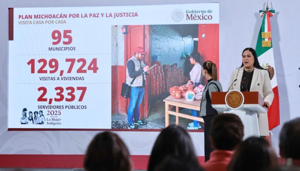 Ciudad de México, 28 de noviembre de 2025.- El Gobierno de México, a través de las Secretarías de Gobernación y de Bienestar, informó que, como parte del Plan Michoacán por la Paz y la Justicia, se realizarán durante noviembre y diciembre de 2025, 16 Ferias del Bienestar, 4 Sí al Desarme, Sí a la Paz y 2 Tianguis del Bienestar. Además de que se lleva a cabo una visita casa por casa a un millón 282 mil 948 viviendas de los 113 municipios de la entidad.