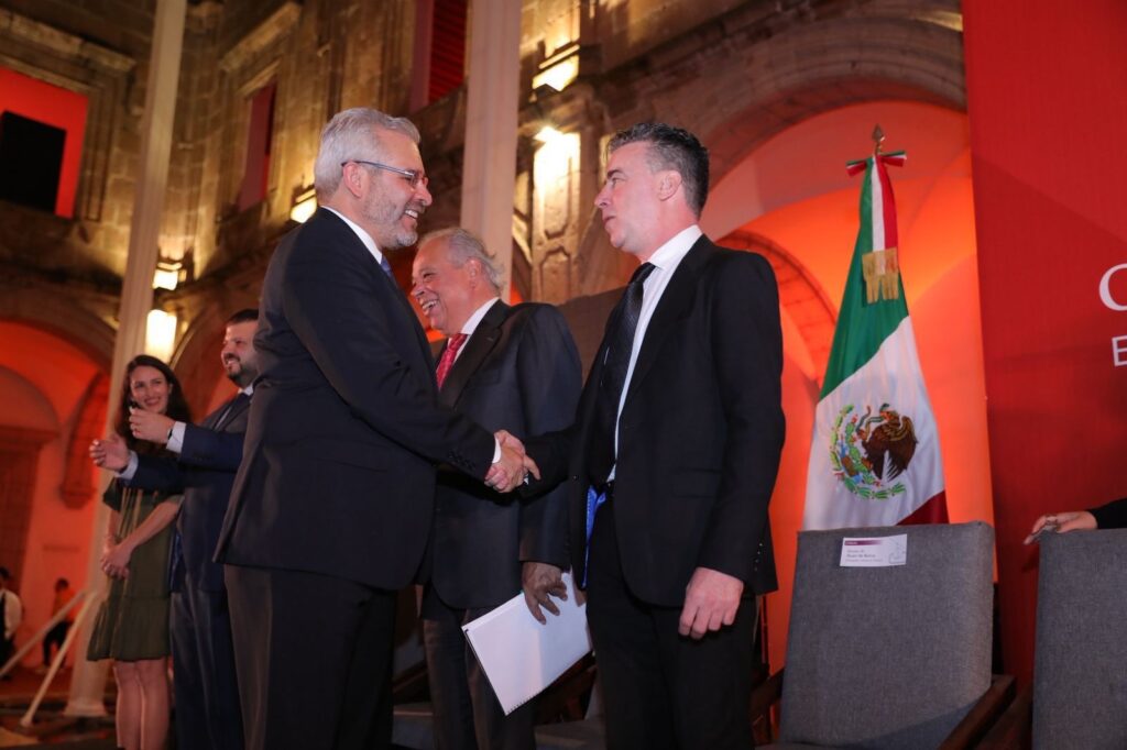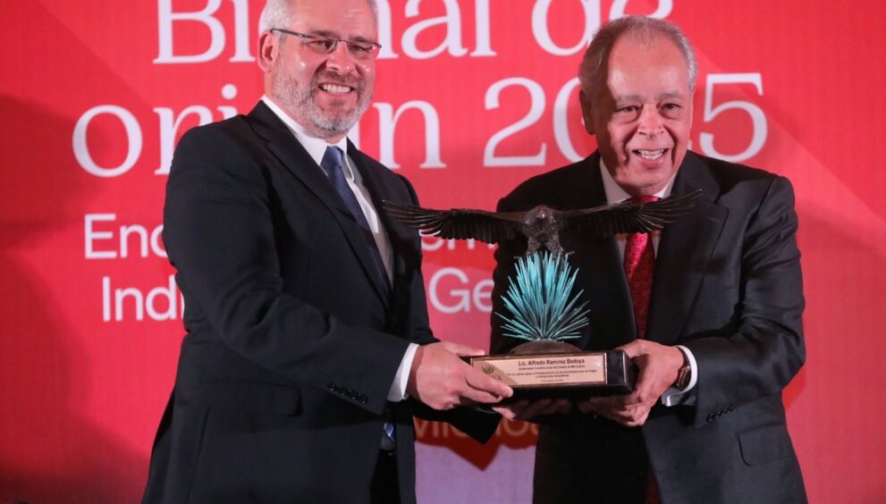 Morelia, Michoacán, 10 de octubre de 2025.- El Consejo Regulador del Tequila (CRT) reconoció al gobernador Alfredo Ramírez Bedolla con el galardón “El águila en vuelo”, por el respaldo que ha brindado a las Indicaciones Geográficas y Denominaciones de Origen.