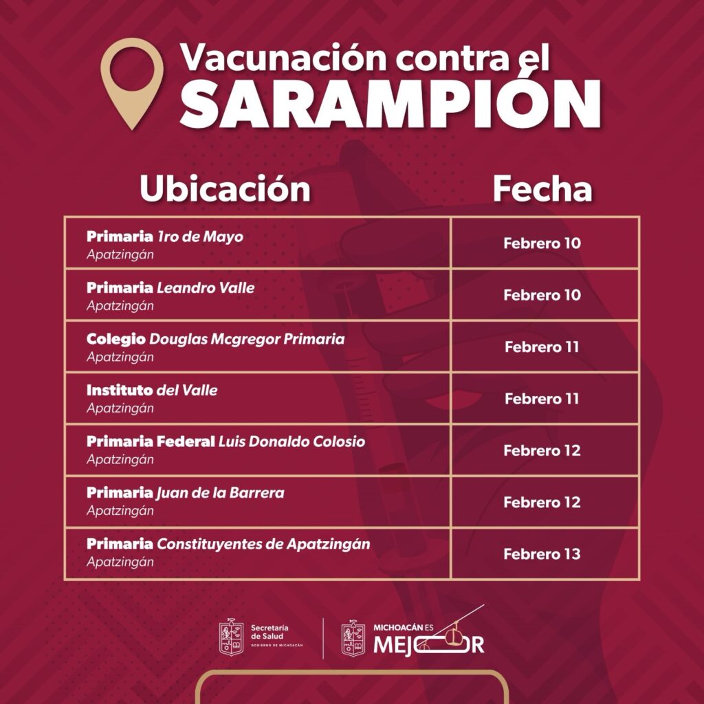 En Apatzingán, habrá jornada de vacunación el 10 de febrero en las primarias “1 de mayo” y “Leandro Valle”; el 11 de febrero en la escuela “Mc Gregor” y el Instituto del Valle de Apatzingán; el 12 de febrero en las primarias “Luis Donaldo Colosio” y “Juan de la Barrera”, y finalmente, el 13 en la primaria “Constituyentes de Apatzingán”.