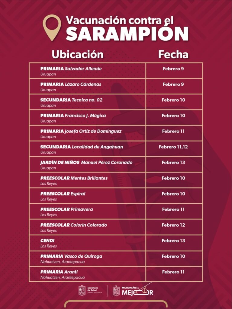 En el municipio de Los Reyes, el 10 de febrero en los preescolares “Mentes Brillantes” y “Espiral”; “Primavera” el 11 de febrero; “Colorín Colorado” el 12 de febrero, y en el Centro de Desarrollo Infantil (Cendi), el 13 de febrero. El 10 de febrero una brigada visitará la primaria “Vasco de Quiroga” y el 11 de febrero la “Aranti” de Arantepacua, municipio de Nahuatzen.