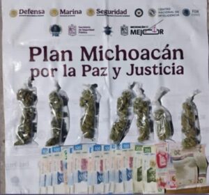 La primera acción, efectuada en la localidad de Pinzándaro, permitió la detención de tres personas en posesión de hierba verde seca, al parecer marihuana. Además, se les decomisaron nueve mil 70 pesos en efectivo en billetes de distintas denominaciones y una camioneta marca Chevrolet.