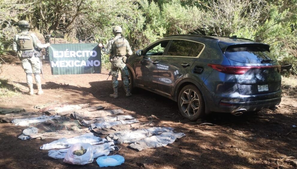 Salvador Escalante, Michoacán, 20 de enero del 2026.- En un operativo interinstitucional conformado por el Plan Michoacán por la Paz y la Justicia, elementos de las secretarías de Seguridad Pública (SSP), de la Defensa Nacional (Defensa) y la Policía Municipal, localizaron e inhabilitaron dos campamentos ilícitos en los que aseguraron droga, uniformes tácticos y dos vehículos.
