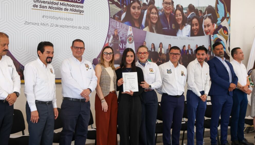 Zamora, Michoacán, a 22 de septiembre de 2025.- “Vivan la Universidad, sientan el peso de su historia, sientan la importancia del significado de nuestro escudo, en nuestro escudo está la victoria, en nuestro escudo está la justicia y está la gratitud, llevenlo muy en alto porque nosotros cargamos con esa historia de nuestra Universidad que tenemos que seguir honrando por el resto de nuestra vida”, afirmó la rectora de la Universidad Michoacana de San Nicolás de Hidalgo (UMSNH), Yarabí Ávila González, ante las y los estudiantes de la Unidad Profesional de Zamora.